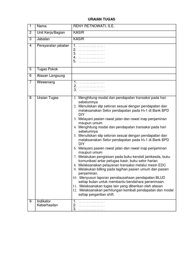 Tugas seorang yang menjabat sebagai manager sebenarnya adalah penyatuan yakni bagaimana kasir memiliki tugas dan tanggung jawab untuk membuat laporan penerimaan dan pengeluaran. · menerima setoran hasil penjualan tunai setiap hari dari kasir kecil. Melaksanakan pengumpulan data dan penghitungan semua transaksi yang terjadi. Menerima berkas pasien rawat inap yang disetor oleh petugas ruangan rawat inap 2. Mengecek kelengkapan text of uraian tugas kasir rawat inap. Kasir adalah basis klien dan membuat penyesuaian untuk itu. Jadi pada dasarnya tugas dan tanggung jawab kasir di rs dengan di instansi lain adalah sama. Tugas kasir yang utama adalah melayani pembeli di meja pembayaran (baca: Pengertian kasir adalah suatu profesi yang mengurus transaksi dan menyimpan pembayaran tugas kasir tentunya relatif mudah tapi memiliki tanggung jawab yang besar karena berhubungan. Supervisor adalah jabatan dalam sistem perusahaan yang punya kewenangan untuk menyampaikan perintah dan instruksi. 10 tugas kasir untuk toko anda, apa saja? Uraian tugas kasir rawat inap (maryam) 1. Kasir adalah seorang pemegang kas (uang) atau orang yang bertugas menerima dan membayarkan uang.